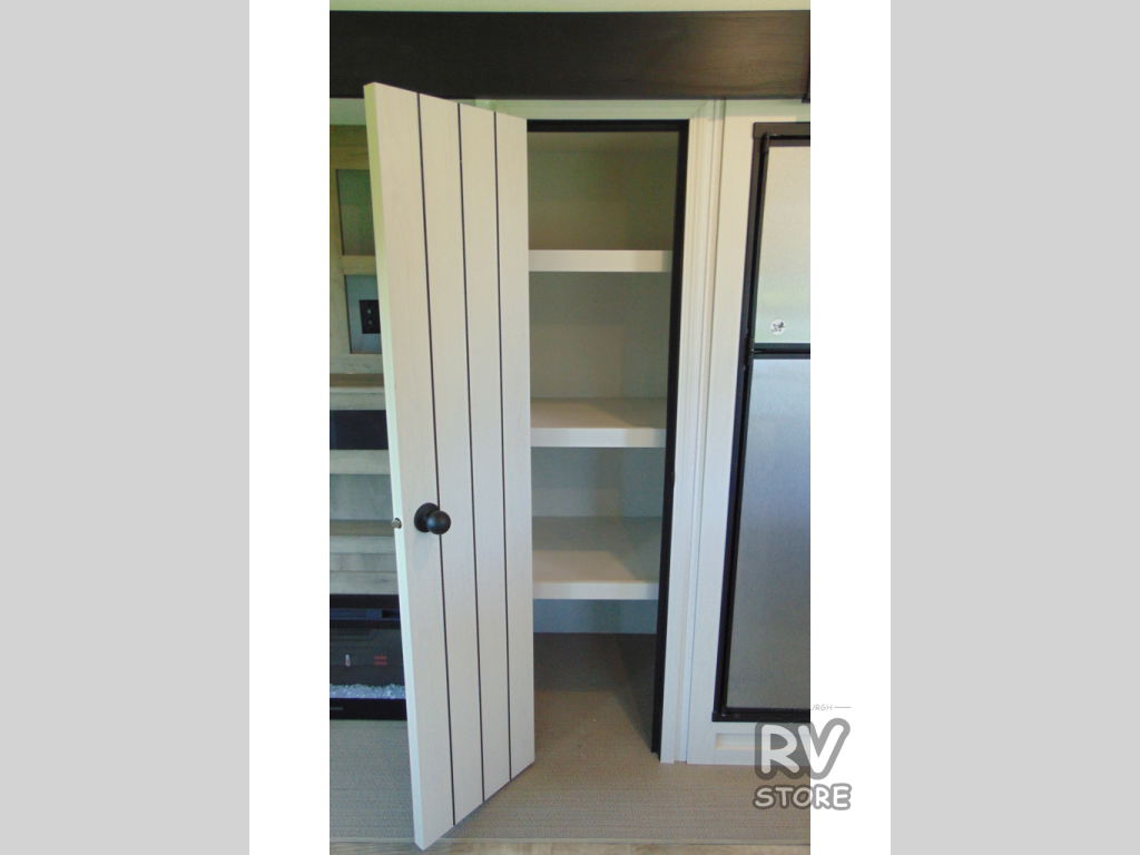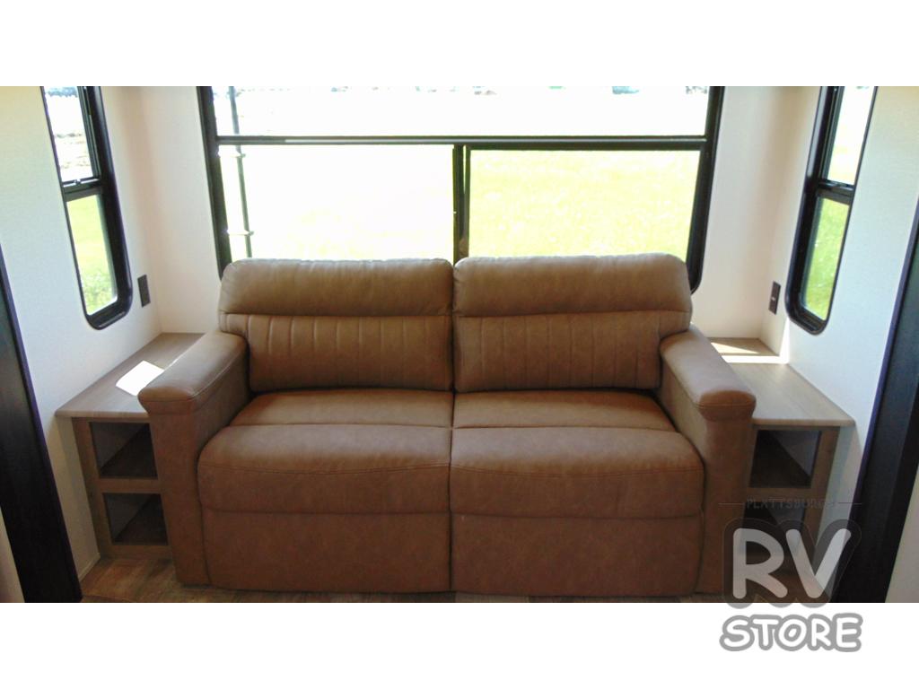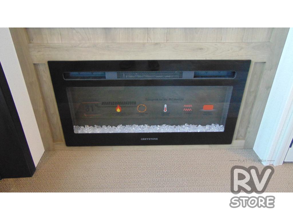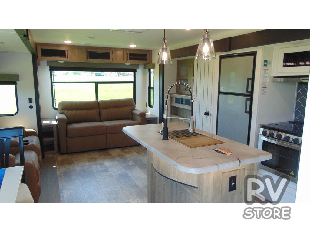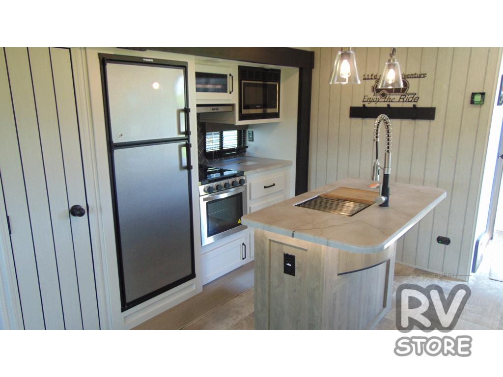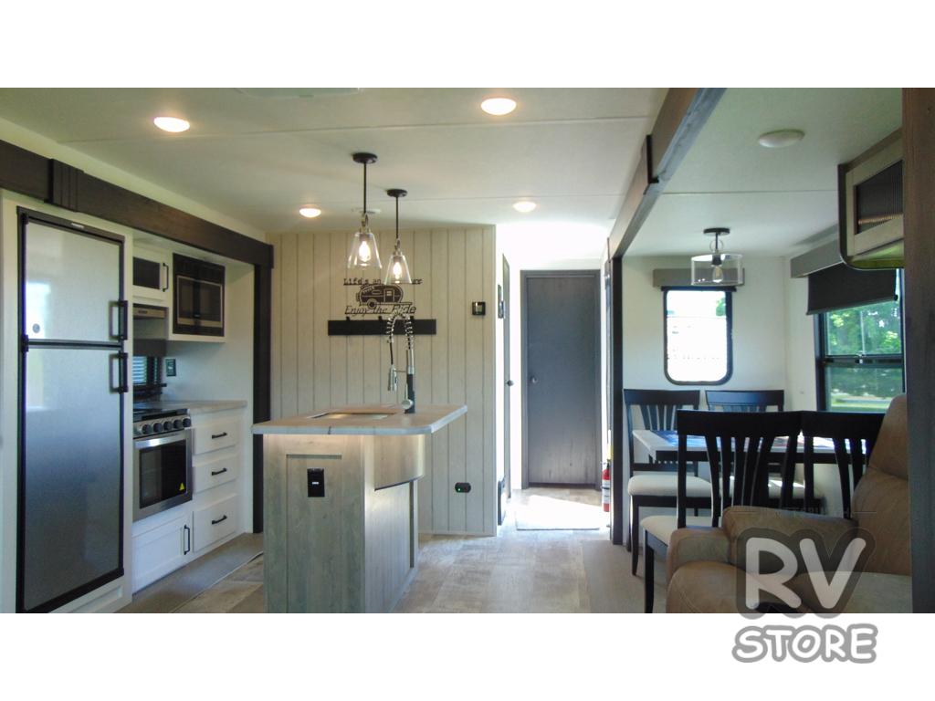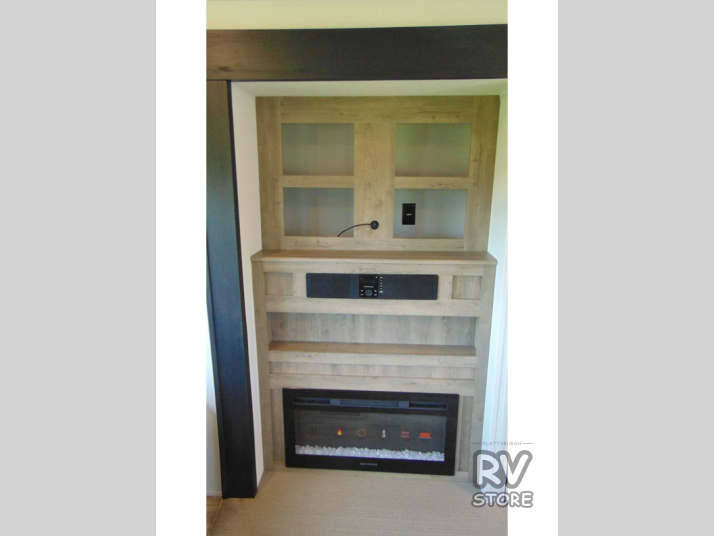 You're going to feel right at home in this travel trailer! The front private bedroom has a queen bed slide for a good night's rest, a dresser and front closet for your clothes, and another closet with washer and dryer prep. Freshen up each morning in the full bathroom with the 32" x 40" shower with a seat and then head to the kitchen to fry up some eggs on the stainless steel oven and range. You will also appreciate having a kitchen island for easier meal prep and a walk-in pantry to easily see your canned goods and snacks. The booth dinette offers a comfortable place to dine, play, and even sleep once converted. What better way to wind down your nights than to relax on either the rear sofa or in one of the two recliners across from the entertainment center with a fireplace!