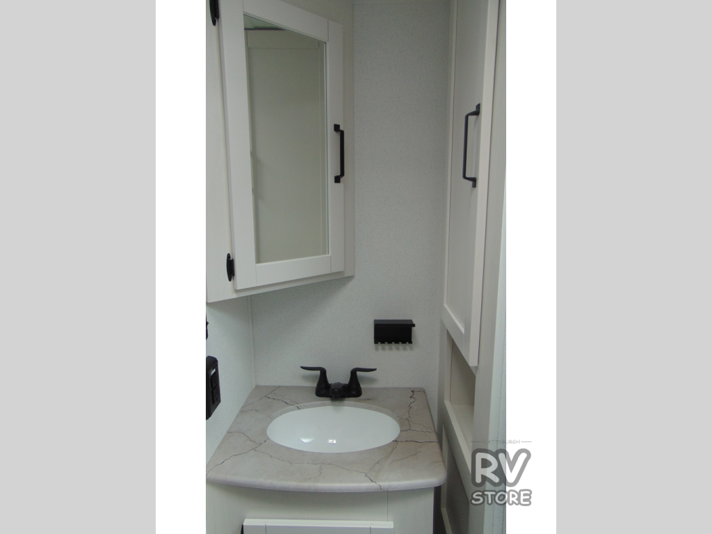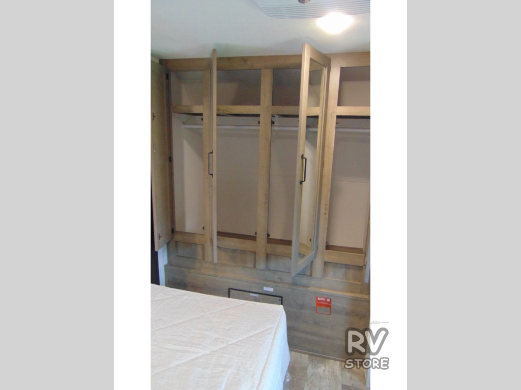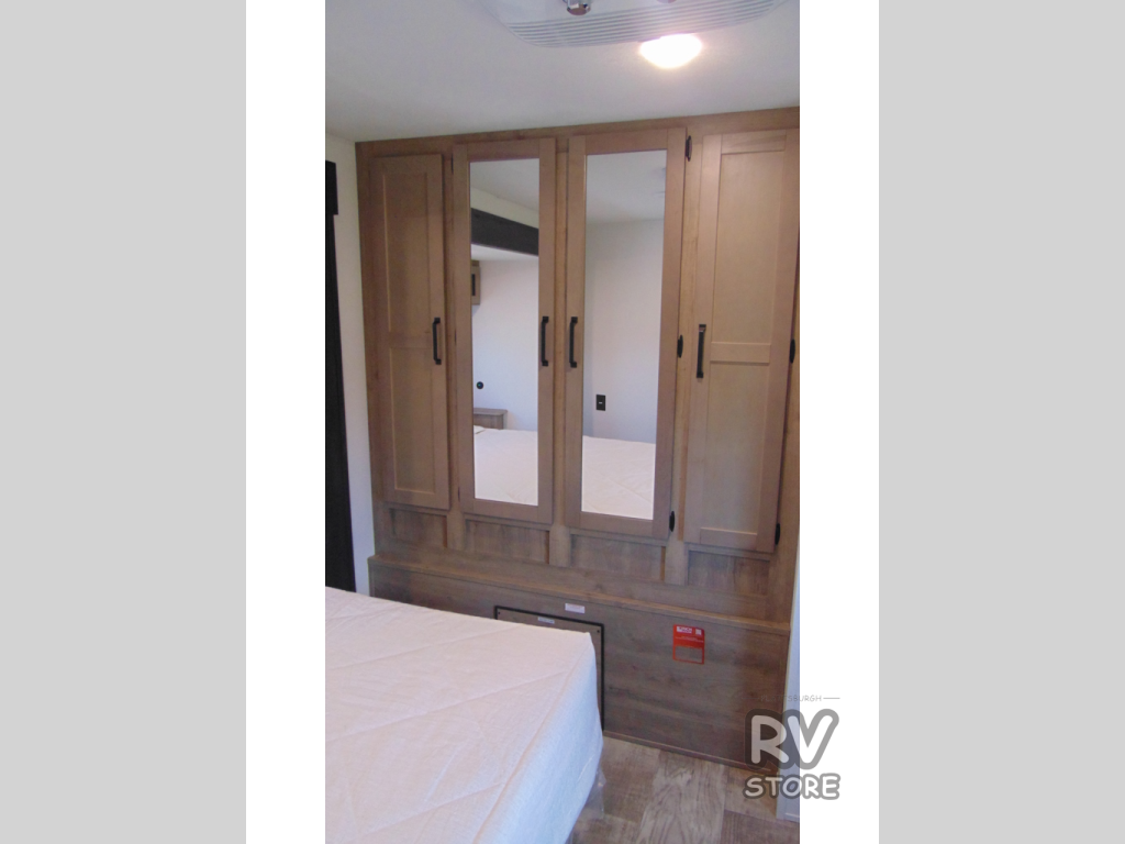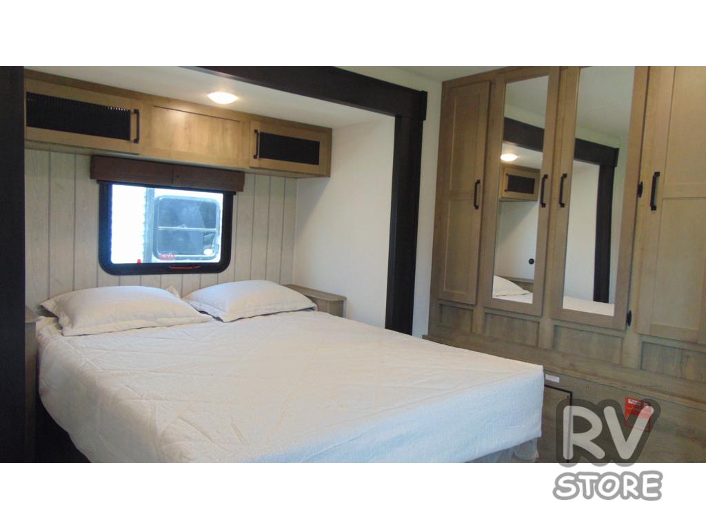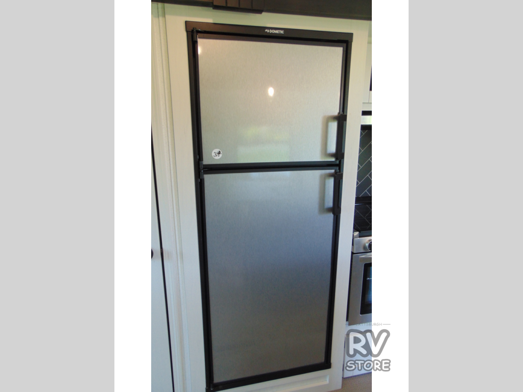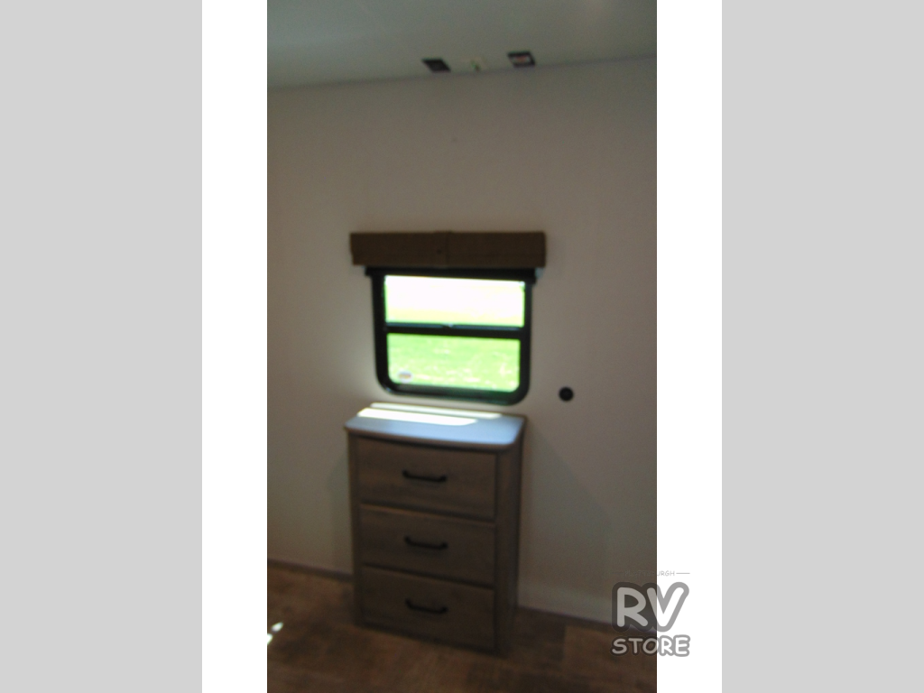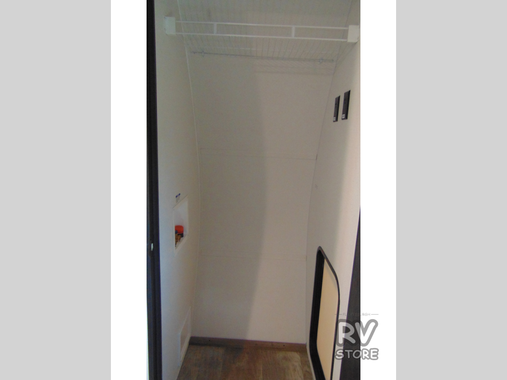 You're going to feel right at home in this travel trailer! The front private bedroom has a queen bed slide for a good night's rest, a dresser and front closet for your clothes, and another closet with washer and dryer prep. Freshen up each morning in the full bathroom with the 32" x 40" shower with a seat and then head to the kitchen to fry up some eggs on the stainless steel oven and range. You will also appreciate having a kitchen island for easier meal prep and a walk-in pantry to easily see your canned goods and snacks. The booth dinette offers a comfortable place to dine, play, and even sleep once converted. What better way to wind down your nights than to relax on either the rear sofa or in one of the two recliners across from the entertainment center with a fireplace!