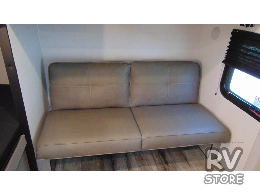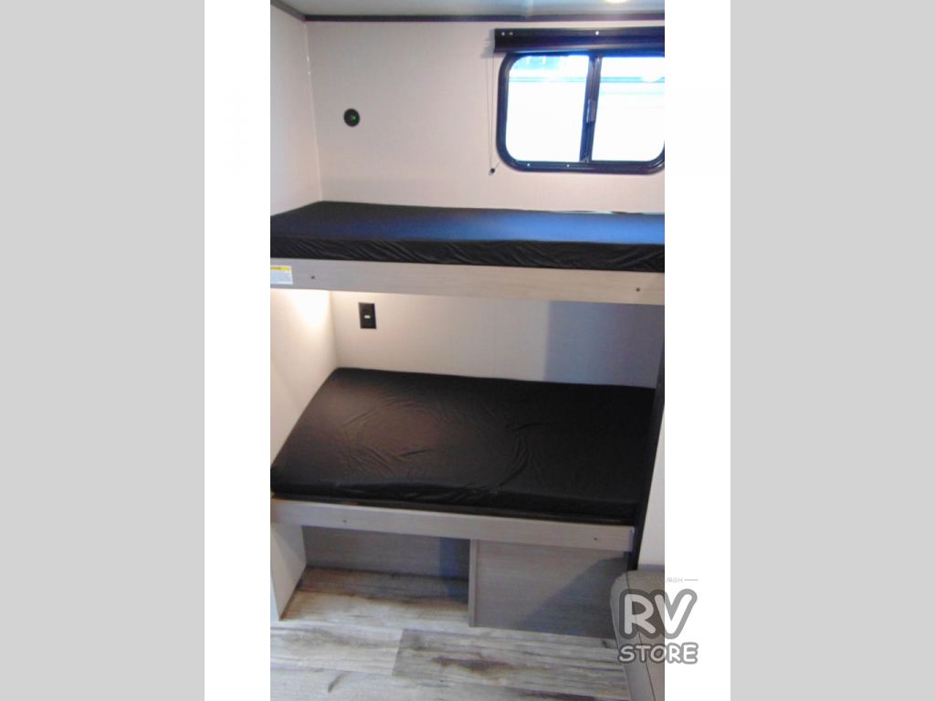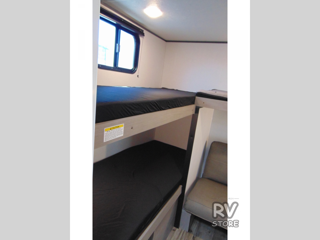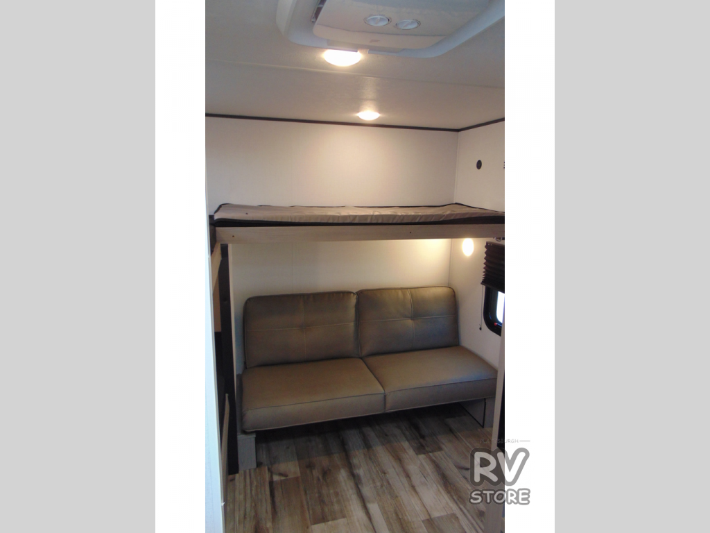 Your whole crew is sure to love this travel trailer since there are two 20" x 74" bunk beds plus a 28" x 66" bunk above a sofa in the back! You can claim the front RV queen bed to yourselves, which gives everyone their own space at night. The fully equipped kitchen will let you make your best campground meals, and there is a spacious kitchen overhead cabinet for spices or dishes. This unit also includes a full bath with a 30" x 36" shower, a toilet, plus a vanity with a medicine cabinet to keep necessities close by!