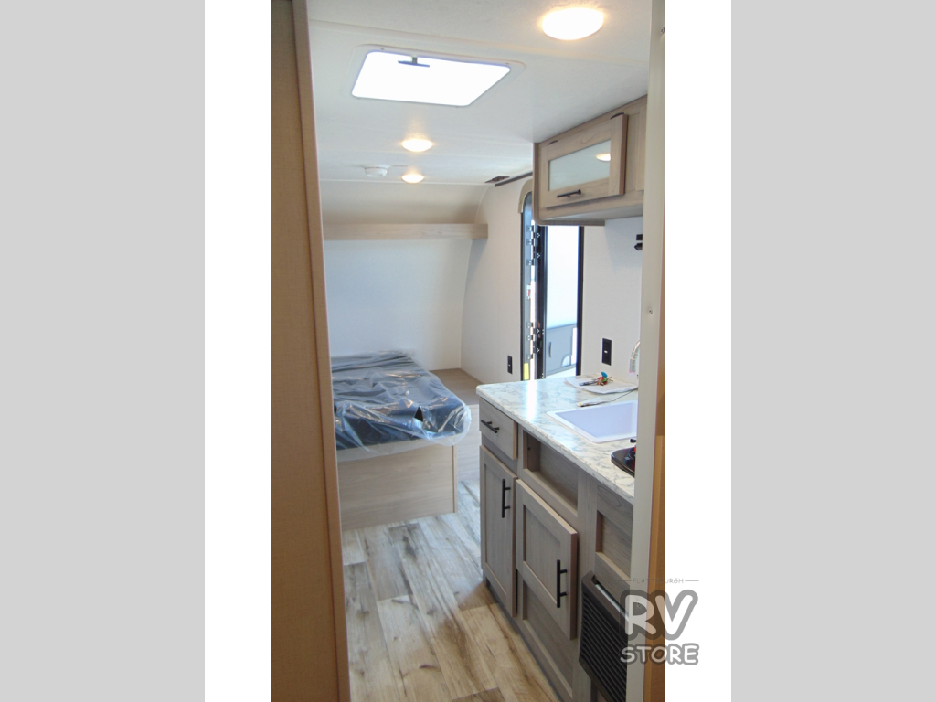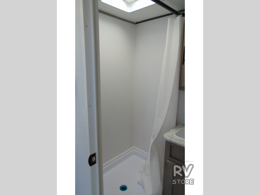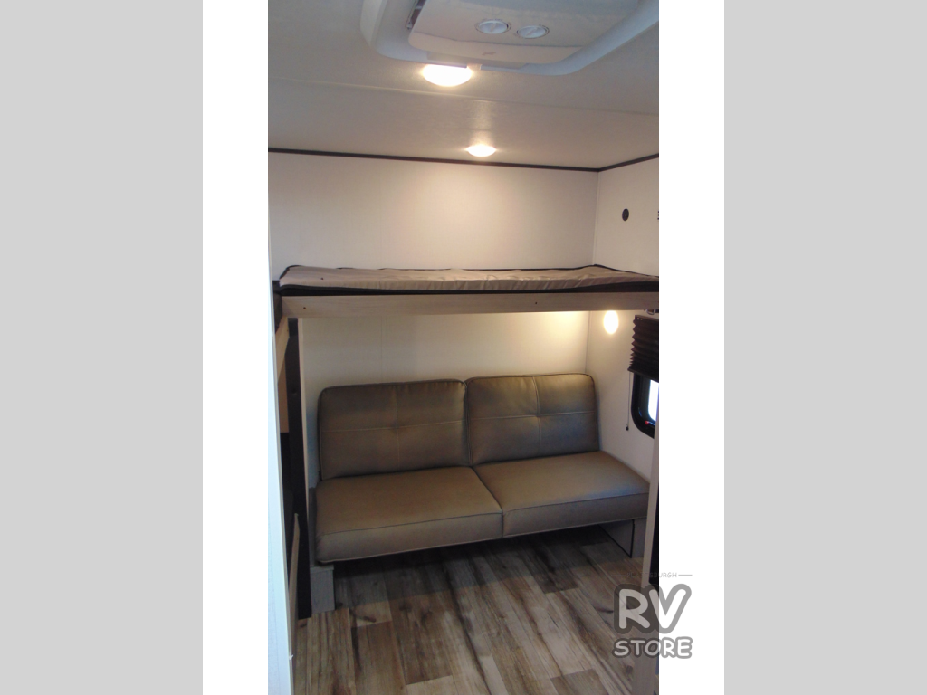 Your whole crew is sure to love this travel trailer since there are two 20" x 74" bunk beds plus a 28" x 66" bunk above a sofa in the back! You can claim the front RV queen bed to yourselves, which gives everyone their own space at night. The fully equipped kitchen will let you make your best campground meals, and there is a spacious kitchen overhead cabinet for spices or dishes. This unit also includes a full bath with a 30" x 36" shower, a toilet, plus a vanity with a medicine cabinet to keep necessities close by!