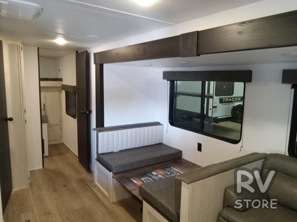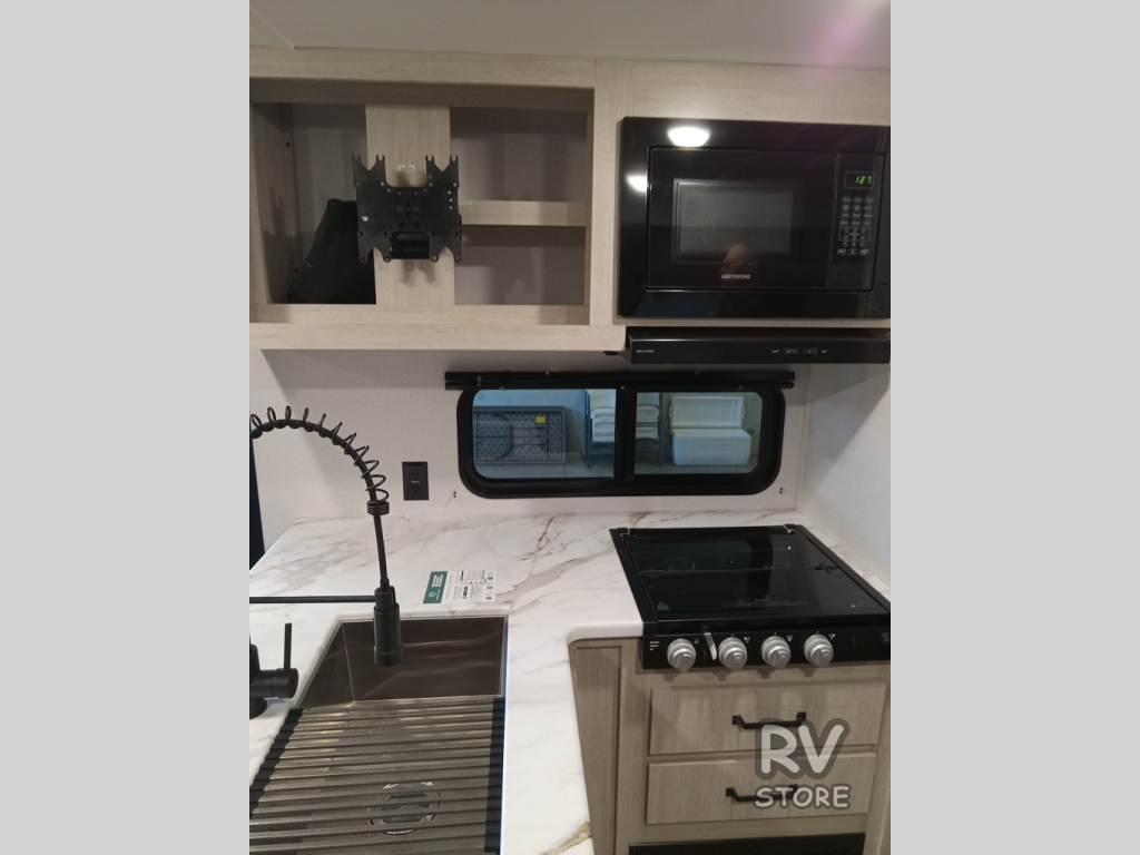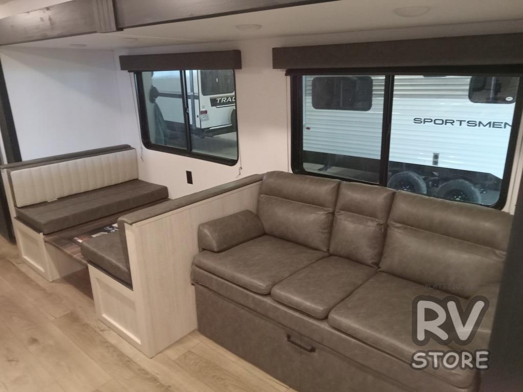 If you're looking for more space, this double axle unit features a large slide so you can walk about freely. Here, you'll find the booth dinette and sofa, which sit across from the optional TV if you want to enjoy movie nights. The full kitchen includes a stainless microwave and three burner cooktop to make meals, plus a pantry and 12V refrigerator for food storage. And an optional outside mini kitchen with a grill can be added if you enjoy cooking outdoors! Your guests or littles are sure to enjoy the rear bedroom with a queen bed, a 28" x 65" bunk, 28" x 76" bunk, a shirt closet, and a wardrobe so everything has a place!