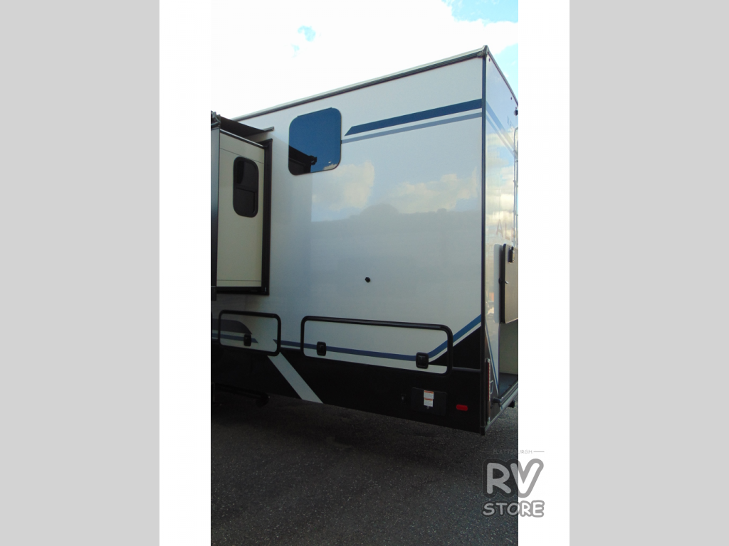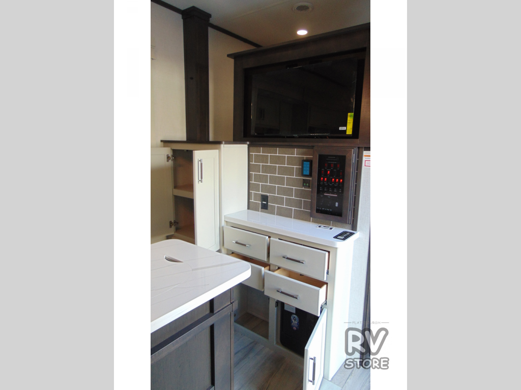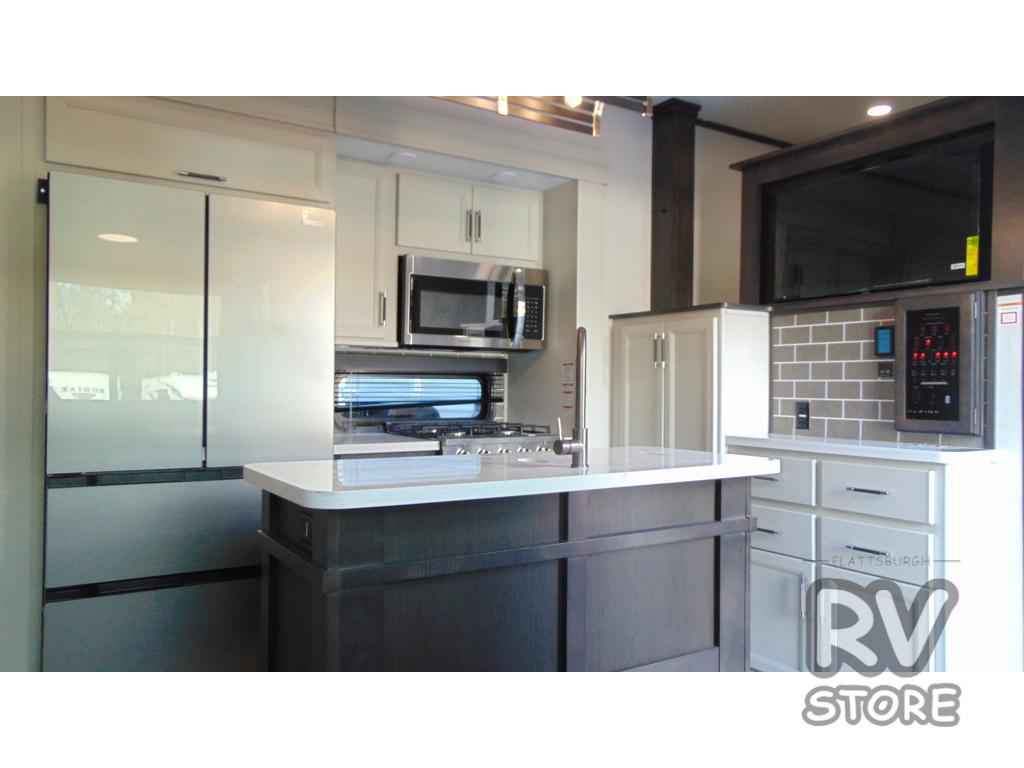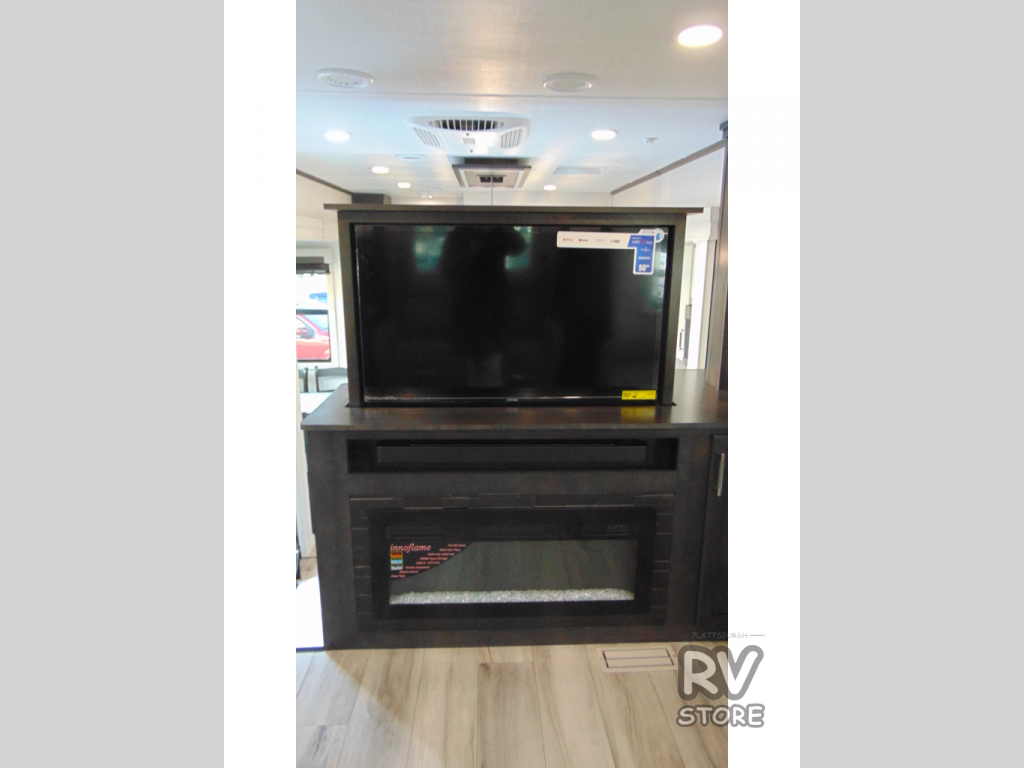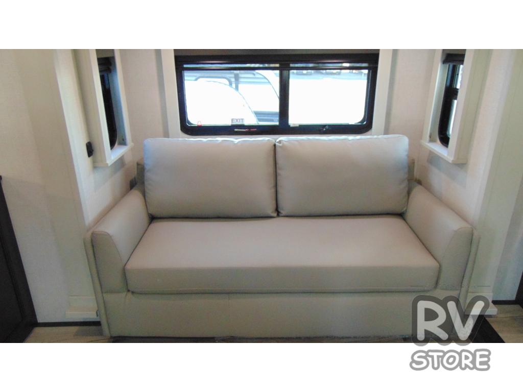 Find the comfort and luxury in this fifth wheel! Imagine your morning coffee on the spacious middle kitchen, and prepping your favorite breakfast on your kitchen island with a sink, making for a good meal-prep zone for endless cooking possibilities. You can start your favorite movie queued up in the living room with dual hide-a-bed sofas and a fireplace that sets the mood for comfort and delight every day. When it is time to unwind, your private rear bedroom welcomes you with a king bed, smart storage, and soft lighting that turns travel into rest, featuring a master bathroom with all you need to freshen up and treat yourself with plenty of storage, a dual sink vanity, and space for a washer/dryer prep for your convenience.