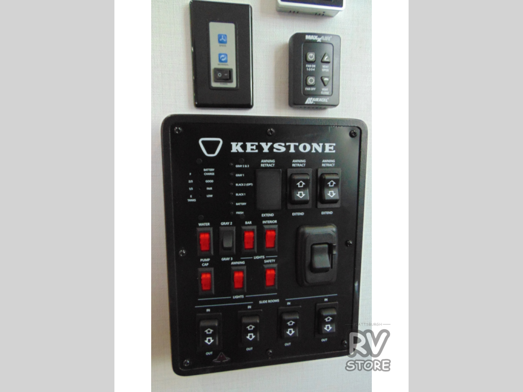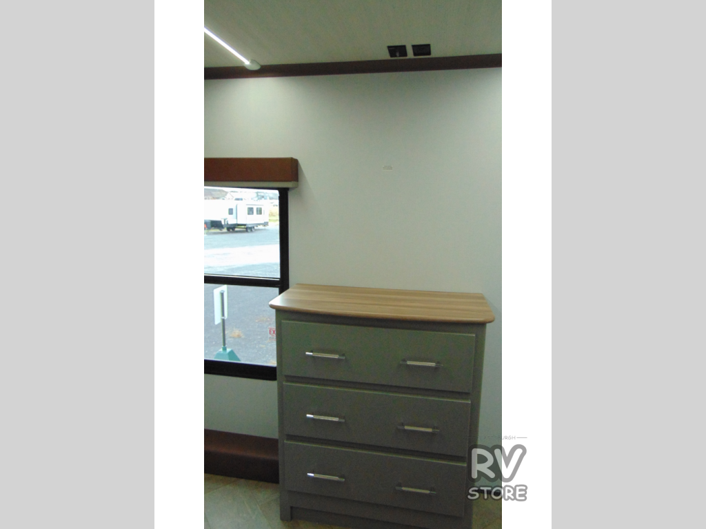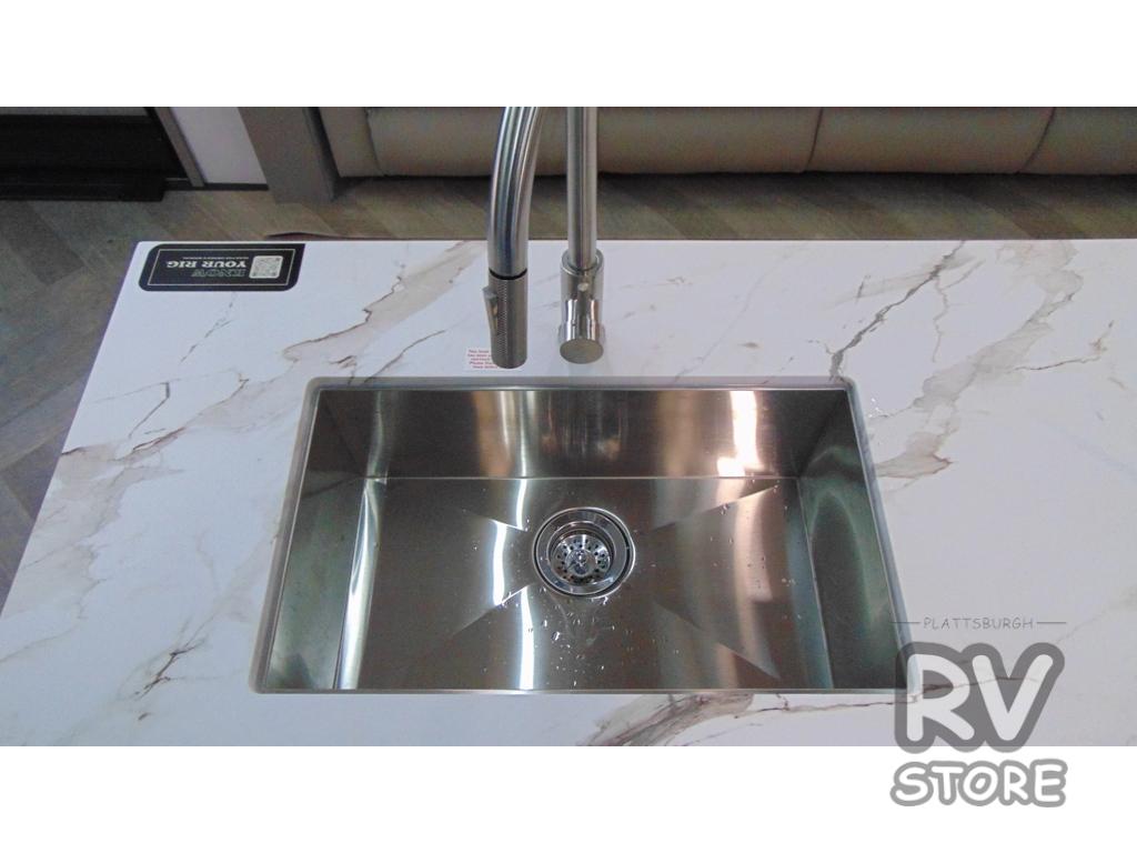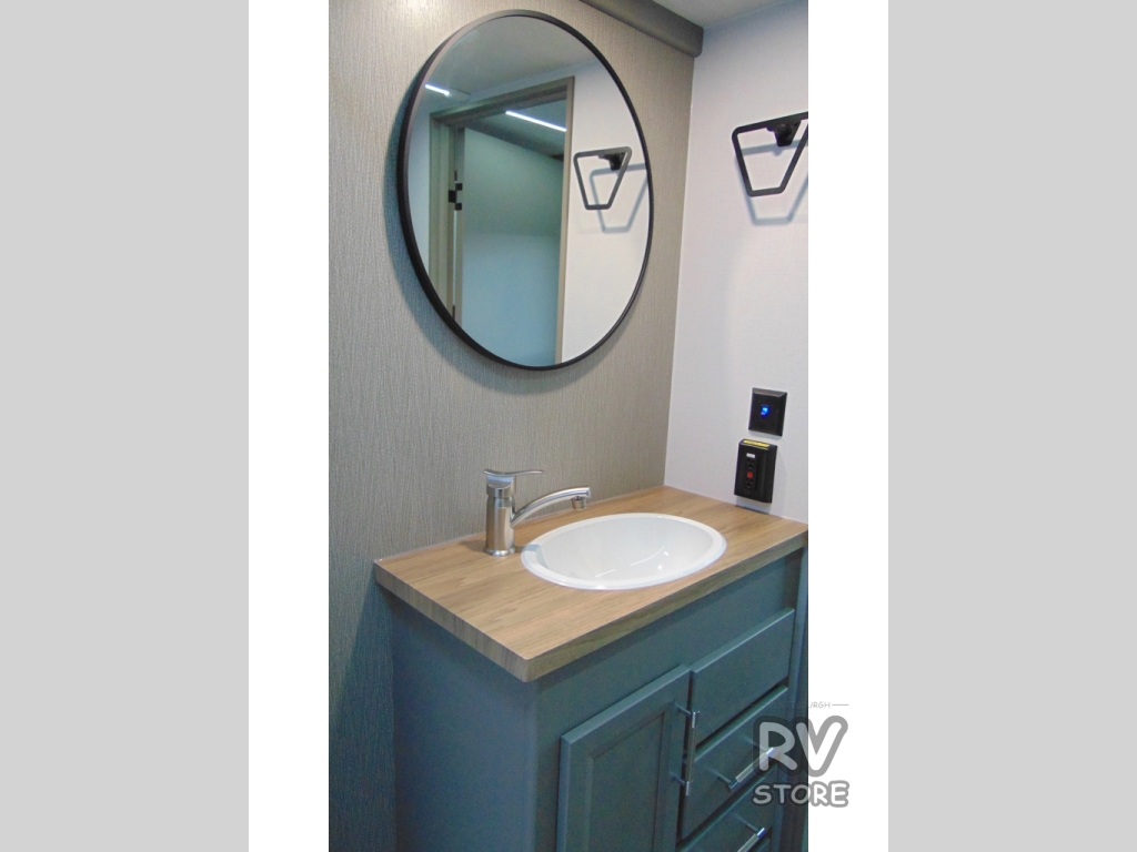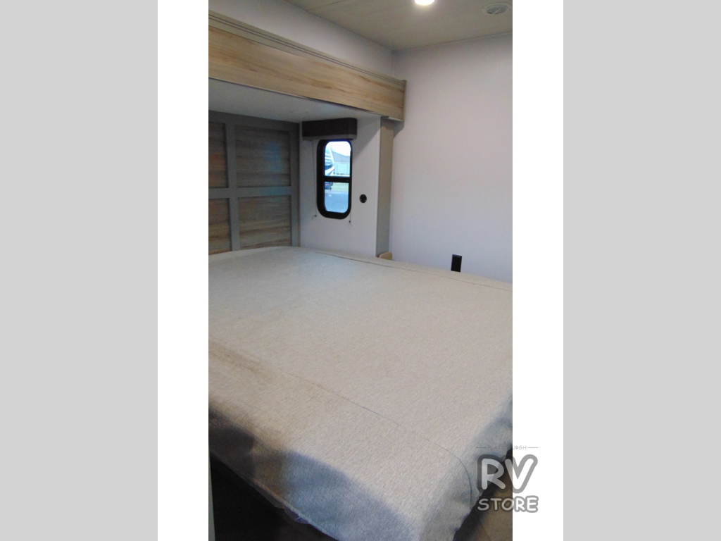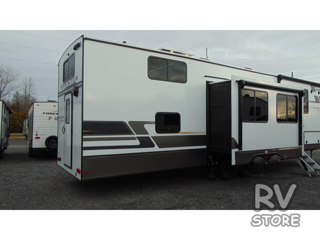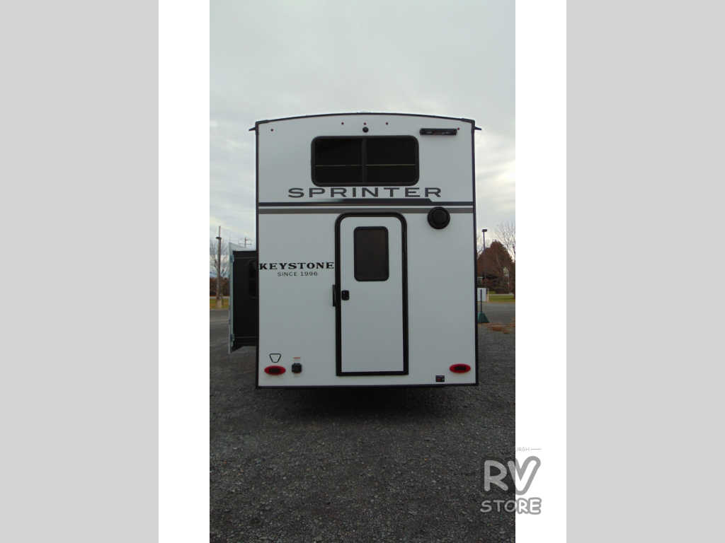 The Sprinter fifth wheels by Keystone feature spacious living areas, plenty of storage, and outstanding towability. Each unit is constructed with 2" aluminum framed and laminated sidewalls, a fully walkable roof, and dual layer insulation to help extend your camping season. The heated pass-through storage includes lockable slam latch baggage doors so you can easily pack your gear, and the one-touch 4-point leveling system features return hookup memory to have you set up in no-time. Head inside to find Congoleum vinyl flooring, Thomas Payne luxury collection furniture, residential style seamless marbled countertops, and an upgraded bedspread to name a few comforts. The Sprinter also includes a Girard tankless on-demand water heater, a central command center, plus a 30k BTU furnace and two A/C units to ensure your comfort!