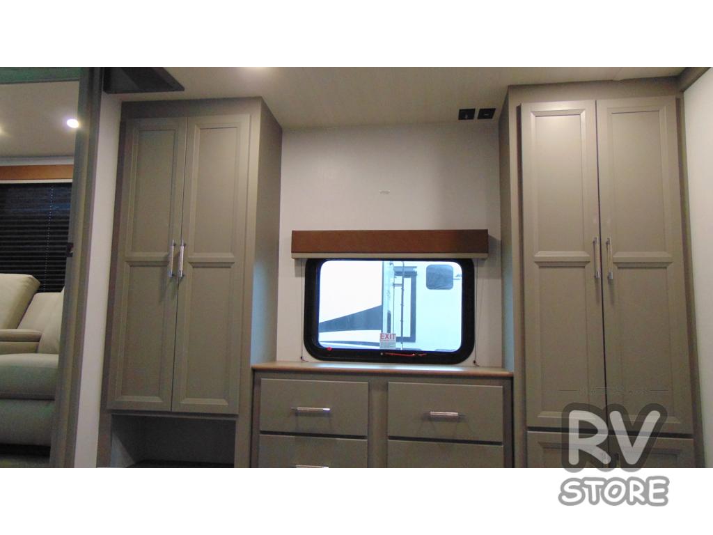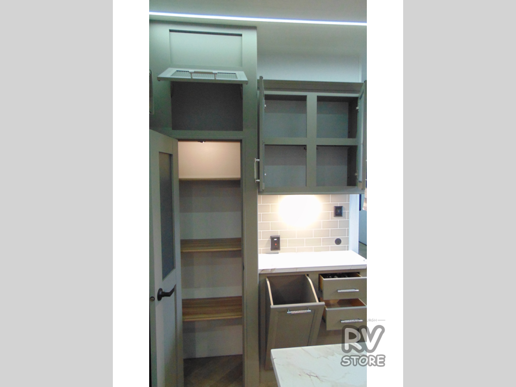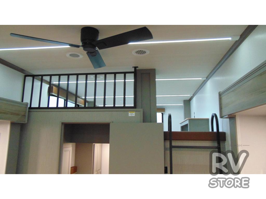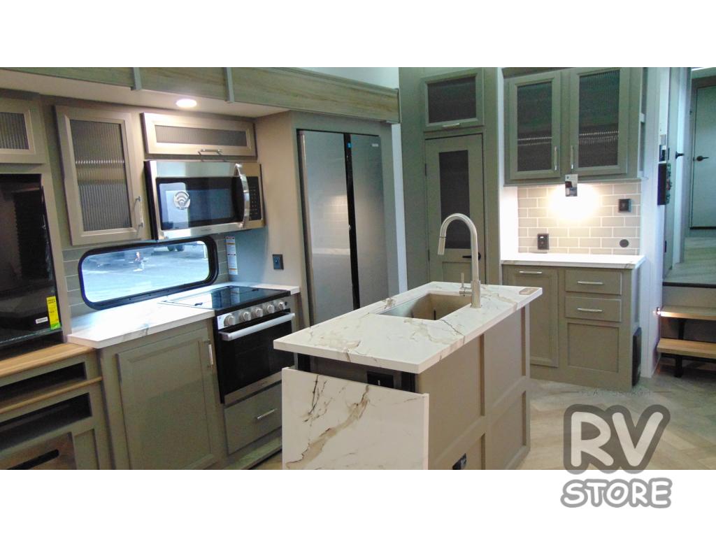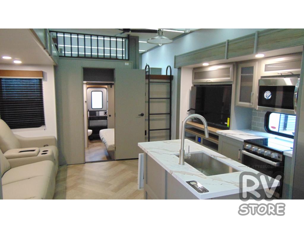 Two bedrooms and two full baths make this fifth wheel perfect for camping with friends and family! The front bedroom includes a king bed slide out with storage underneath, a wardrobe with a shelf, plus a closet with washer and dryer prep if you want to add these appliances. The master suite includes a second king bed slide out, dual wardrobes and a dresser, plus a full rear bath with one of the dual entry doors. There is also a loft area above this room with plenty of space, an entertainment/gaming center, and a ladder. Everyone can meet in the main living area to relax on the theater seating or dine at the booth dinette. And a full kitchen is complete with an island, pantry, 16 cu. ft. 12V refrigerator, and a hutch to name a few convenient features!