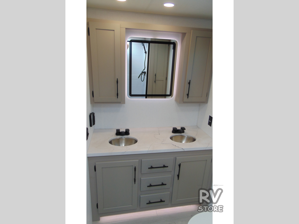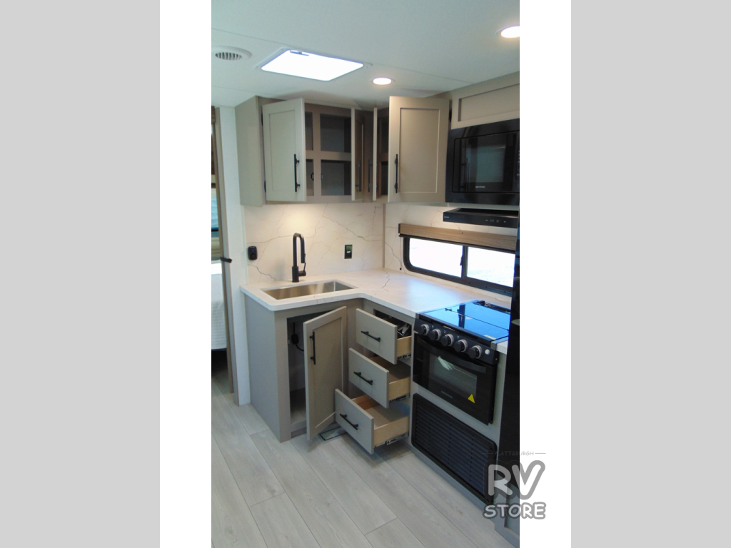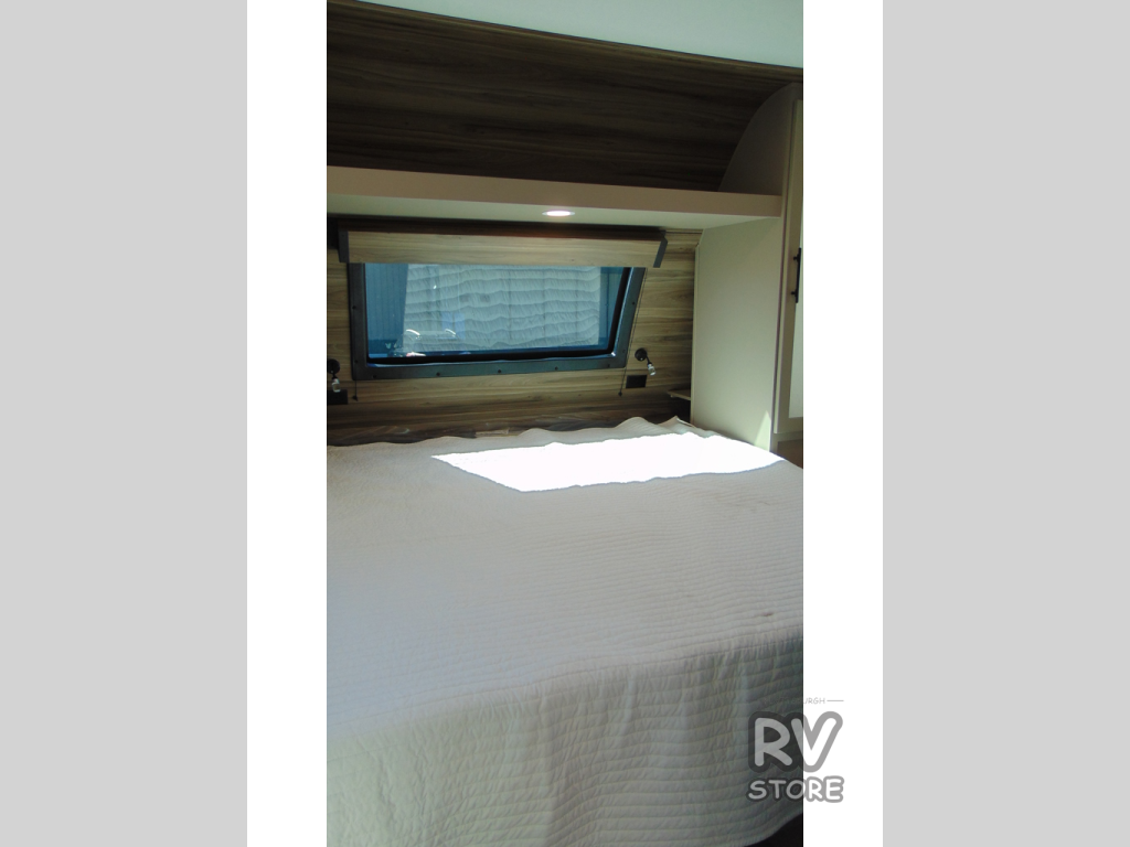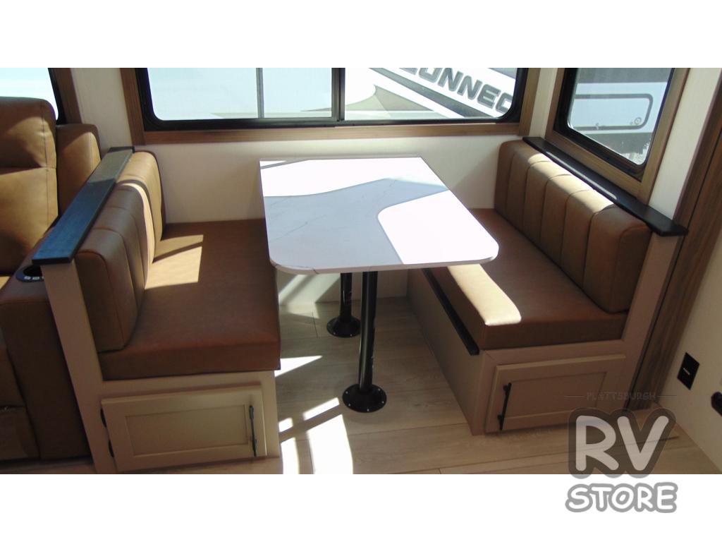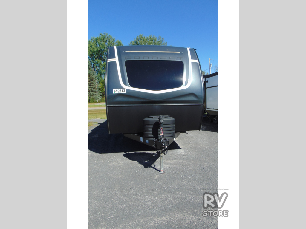 Your needs will be met and your desires will be fulfilled with this Connect travel trailer! Probably the thing you miss most when you camp is your comfortable bed back at home, and that's exactly why this trailer comes with a Serta Comfort foam king mattress in the private bedroom. The other thing you are prone to miss is your bathroom, and the full rear bathroom on this trailer is an excellent replacement with its 30" x 36" shower, skylight, linen closet, MaxxAir vent, porcelain foot-flush toilet, and dual sink vanity. Sit back on the hide-a-bed sofa and enjoy a night of relaxation in front of the LED TV and 34" fireplace. You can even grab a couple of drinks from the 10 cu. ft. 12V refrigerator, snacks from the walk-in pantry with coat hooks, or you can make it a fun evening by playing a game together at the booth dinette.