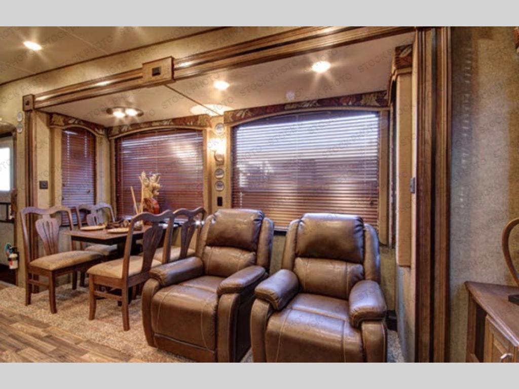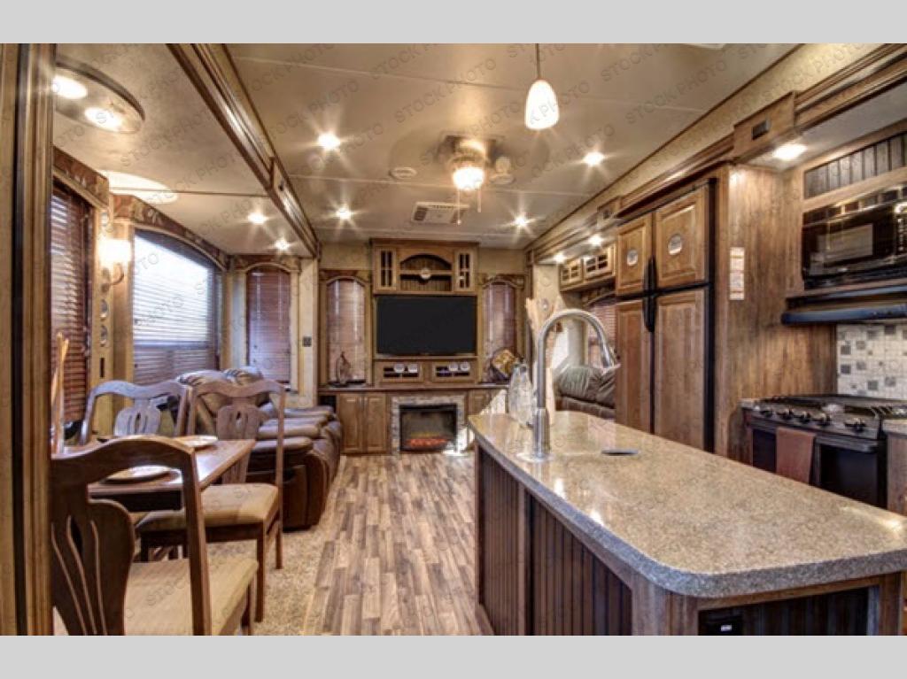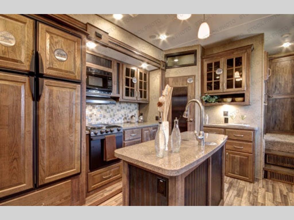 Step inside this model and imagine your next camping trip going up a notch. The spaciousness makes you feel as though you are still at home. Just inside the door to your left there is a slide out free-standing table with four chairs and two lounge chairs. On the opposite side of the fifth wheel you will find that the opposing slide has a tri-fold sofa sleeper, an 18 cu. ft. refrigerator, three burner range, residential microwave, and overhead cabinet for dishes. In the middle of the kitchen you will find an island with a double sink. There is also a pantry near by, and a curio cabinet.