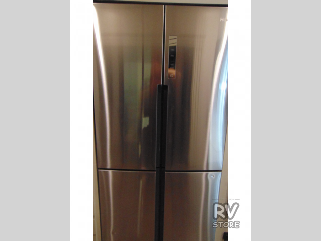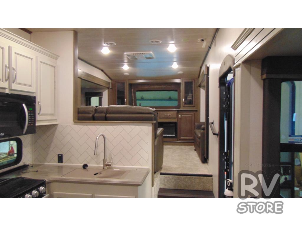 Man cave, TV room, family space, and/or extra bedroom are a few ways you can use the front living area with a pop-up TV that has a fireplace below. Everyone will have seating with two tri-fold sleeper sofa slides and two theater seats, and/or some might decide to play games at the legless dinette table or choose the free standing dinette option in the separate kitchen. The dual entries offer a smooth flow of traffic when the whole family is with you, and the spacious kitchen has lots of counter space, a pull-out pantry, and all the kitchen amenities needed to keep everyone fed. Access the full bathroom from the hallway to get cleaned up, and relax on your own queen bed in the rear bedroom whenever needed. You will find a closet prepped for a washer/dryer option, shoe garage underneath the bed, and three wardrobes for plenty of clothing storage.