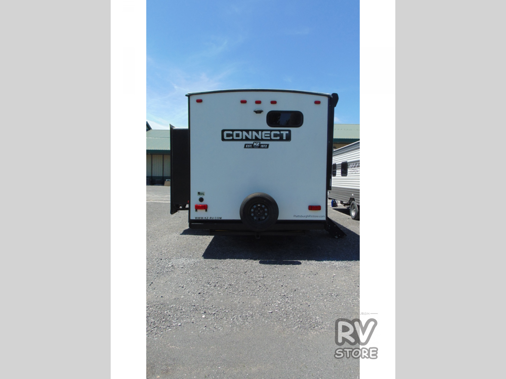 The KZ Connect travel trailer is a trailer with extreme style and creative floorplans! Wrapped up in a lightweight package, the Connect has gorgeous interior décor and a high-end fiberglass exterior. You will find a fiberglass front cap with front windshield, a power front jack, exterior speakers, a spare tire, Equa-Flex suspension, nitrogen-filled tires, a leash latch, and a heated, insulated, and enclosed underbelly, and that's just the beginning. There is still plenty more to check out, like the well-appointed interior that has a kitchen skylight, an HDMI/USB charging port, LED motion-sensor lights, an electric fireplace, and upgraded linoleum flooring.